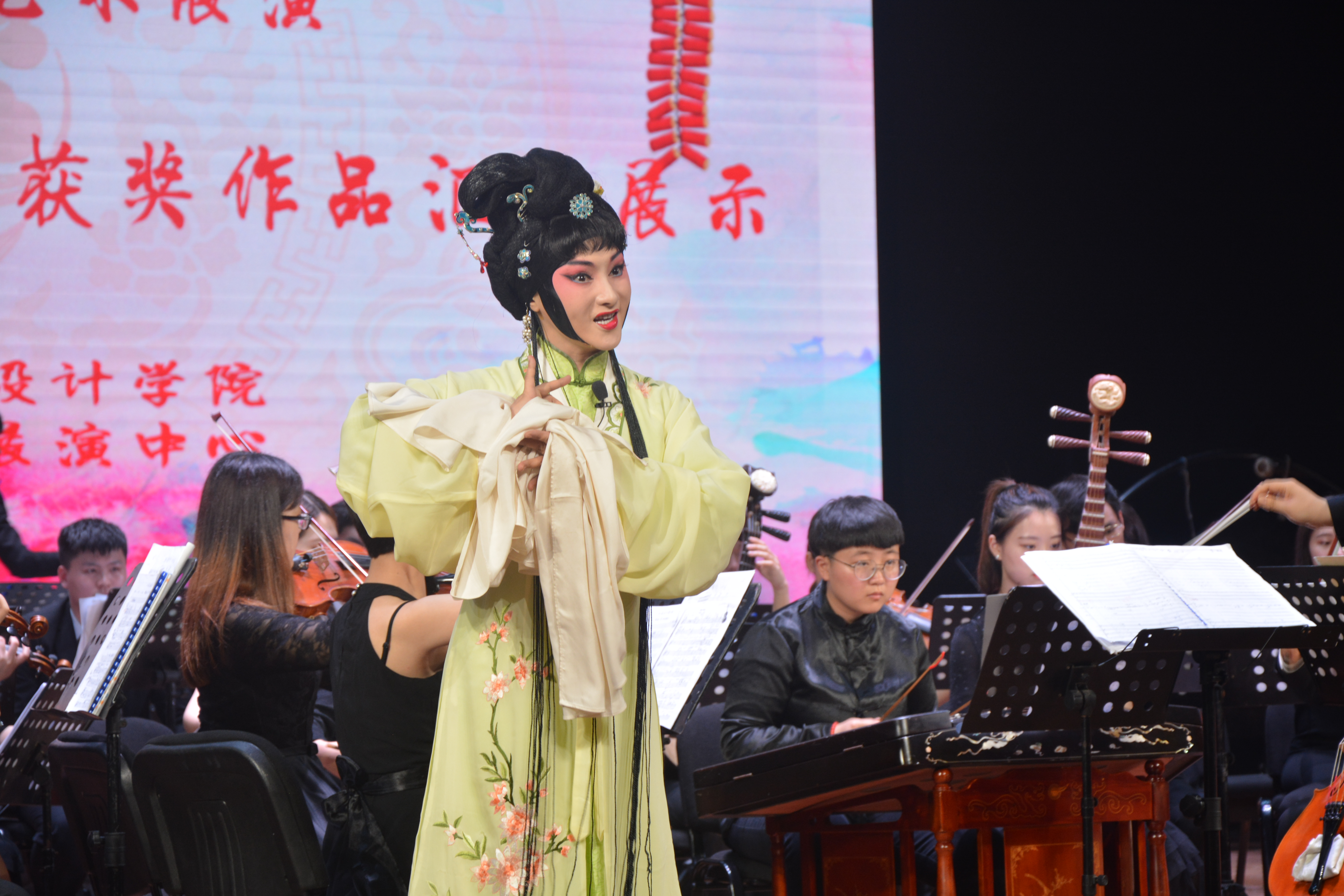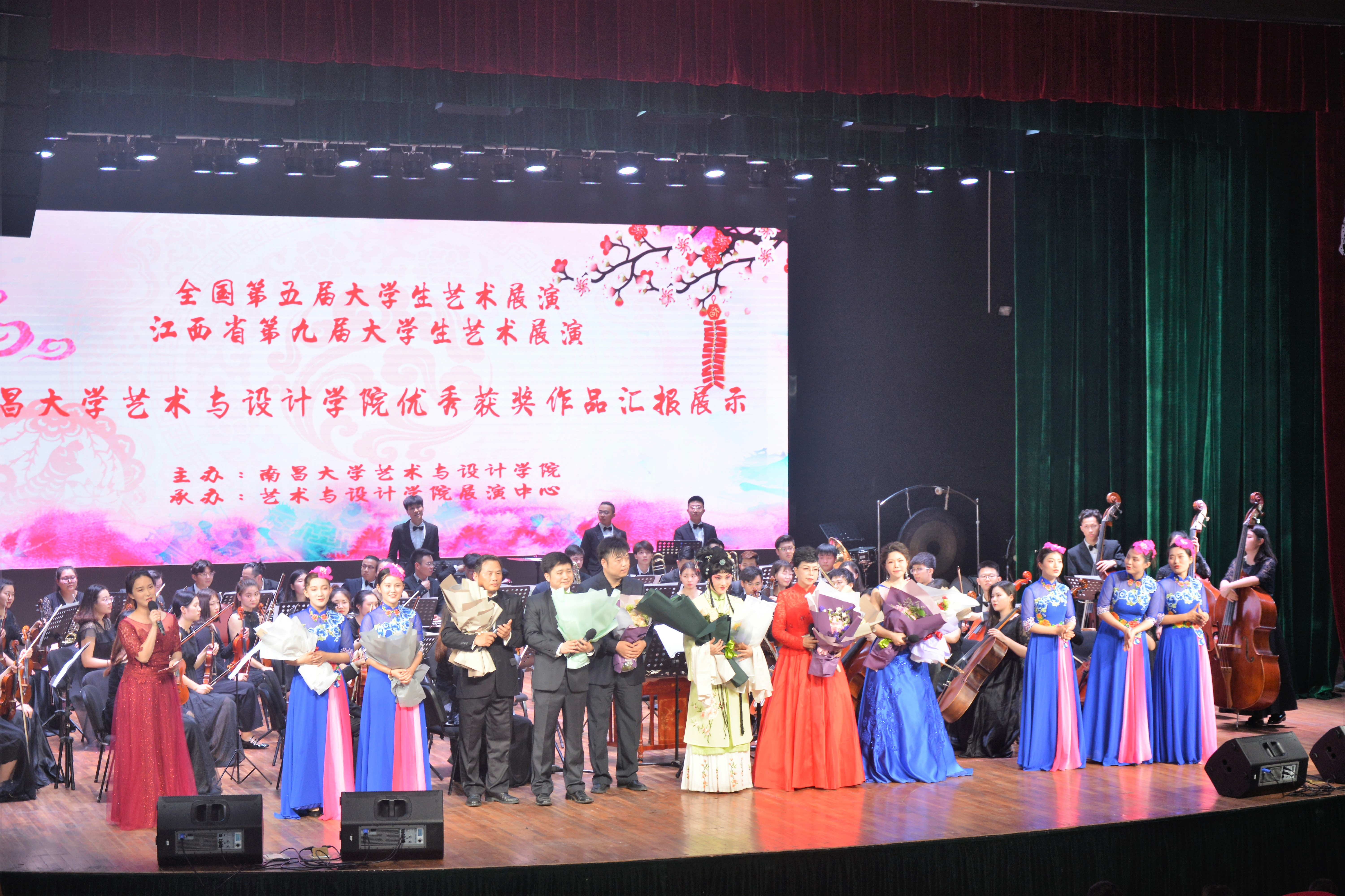 民乐合奏《丝路驼铃》浑厚悠扬的演奏声完美地诠释了丝绸之路上的异域风情。管乐合奏《亚美尼亚舞曲》呈现出地方民谣极富节奏的表现力。女声五重唱演绎着精湛的技艺与悠扬的旋律。全国大学生艺术展演二等奖原创舞蹈《野火》,向观众述说着战争的残酷与广大人民奋,起抗战的爱国精神。全国大学生艺术展演一等奖交响乐团合奏《荒山之夜》,忽而磅磗宏大,忽而绵长纤细,忽而归于宁静,更是将艺术展演推向高潮。国家艺术基金项目赣剧《红珠记》华美的灯光、动人的音乐,精致的扮相演绎着地方戏精粹。时光在在不知不觉中流逝,最后全体演员慷慨激昂地唱起《我爱你,中国》,表达对祖国未来的美好希翼与祝愿,展演在激昂的歌声与接连不断的喝彩声中圆满落幕。